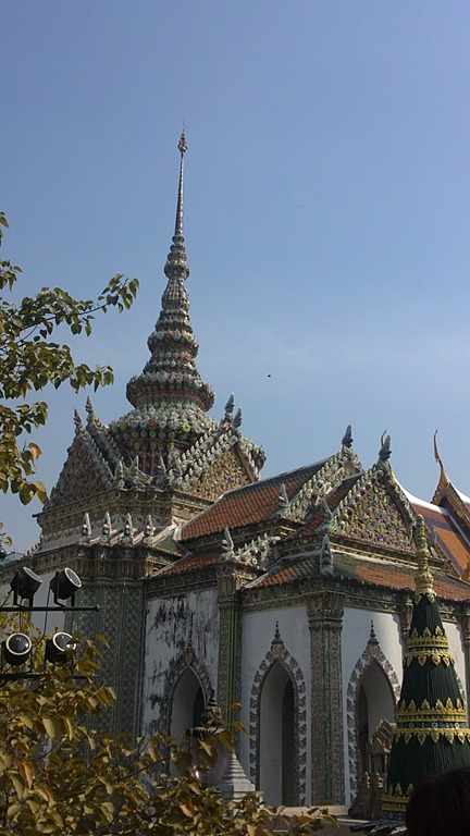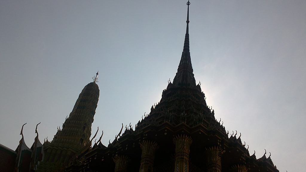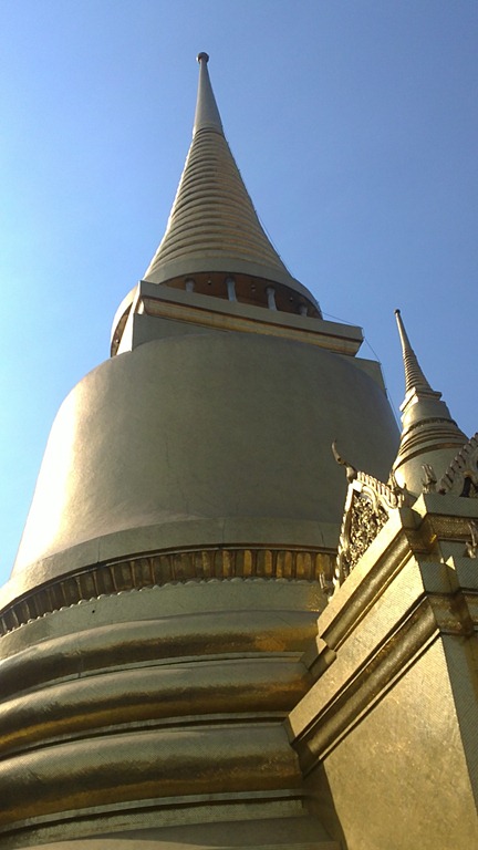 Her er to tyber stupaer fra Grand palace – den “rocket” agtige er Cambodia stil og kaldes “prang”. Den store er en Thai-stil stupa.