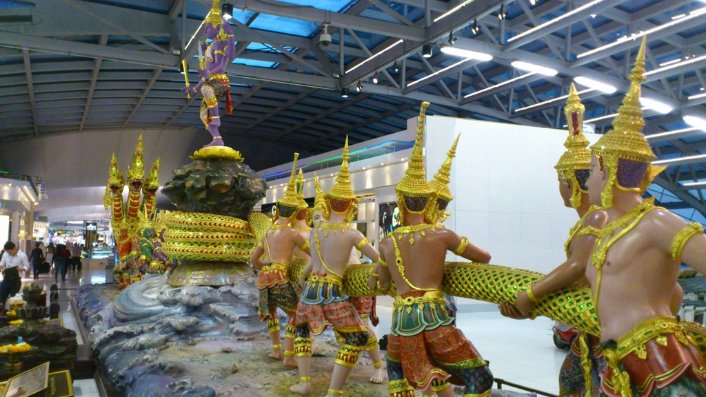 På vej der hen – efter sikkerhedskontrollen, hvor jeg for øvrigt fandt ud af endnu en fordel ved på et tidspunkt at investere i en Tablets – det er kun laptops der skal ud af tasken ved sikkerheds kontrol – tablets kan pænt blive hvor de er. Men på vejen der hen kom jeg forbi statuen af samarbejdet mellem guder og dæmoner mens de kværnede urhavet af mælk. En af de gamle hinduistiske legender. Denne statue fik mine tanker kraftigt ind på de mange i Bangkok der netop nu har deres hjem svømmende rundt i beskidt vand. Noget der kræver samarbejde på tværs af politik og religion.
